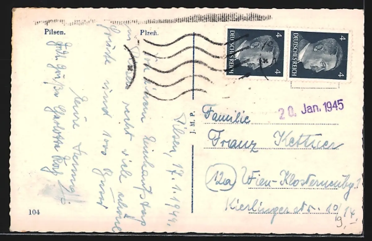 Personenbezogene Daten auf der Rückseite der Karte wurden durch blauen Textmarker unkenntlich gemacht. Die blauen Stellen sind auf die Vorderseite durchgeweicht und wirken sich negativ auf das Postkartenfoto aus