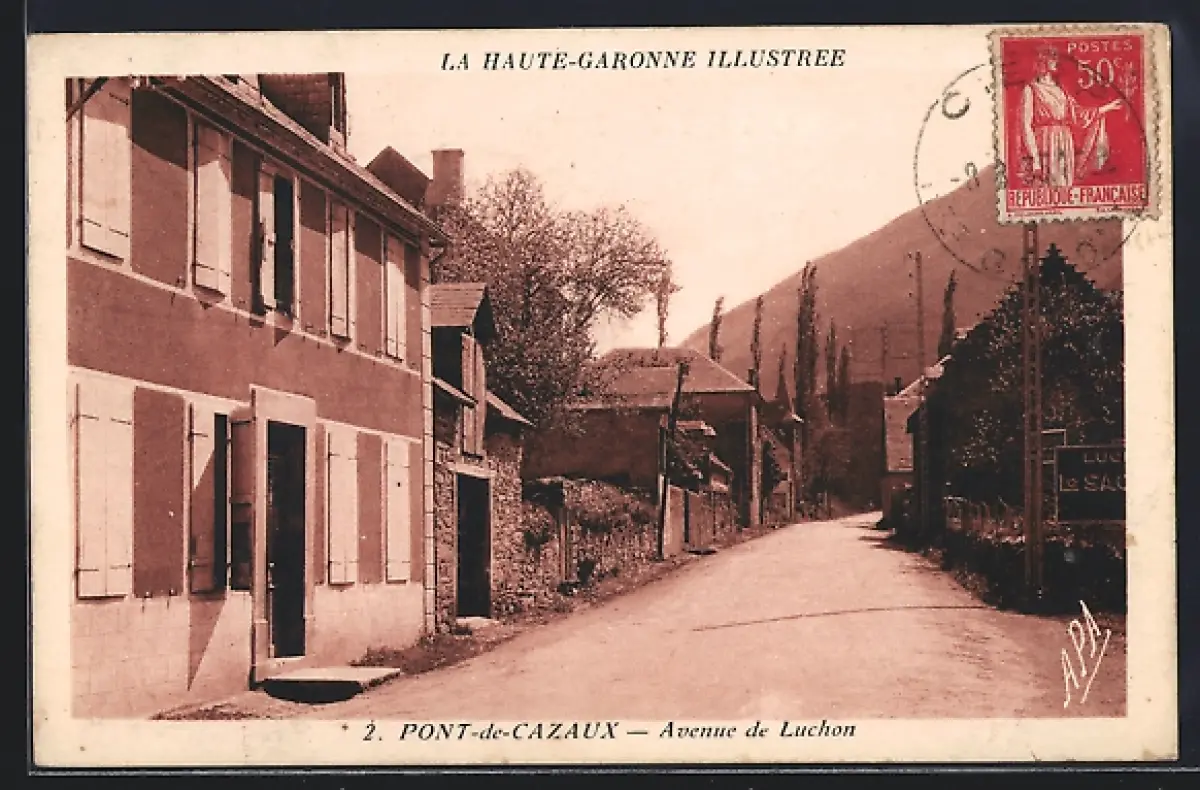 AK Pont-de-Cazaux /La Haute-Garonne, Avenue de Luchon avec vue sur la route bordée de maisons et de collines