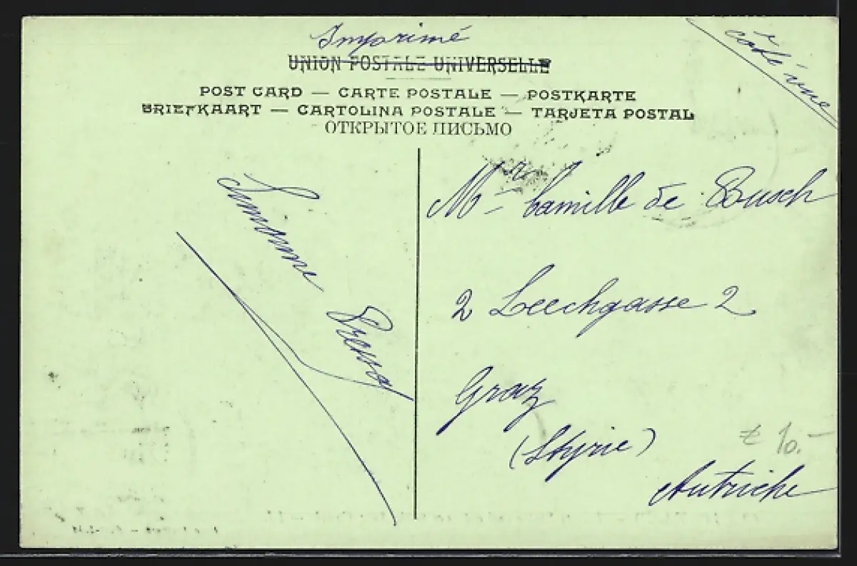 Personenbezogene Daten auf der Rückseite der Karte wurden durch blauen Textmarker unkenntlich gemacht. Die blauen Stellen sind auf die Vorderseite durchgeweicht und wirken sich negativ auf das Postkartenfoto aus