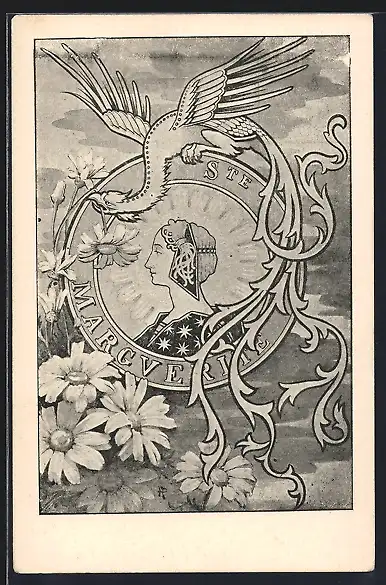 AK Portrait einer Frau mit Blumen und Phönix im Jugendstil