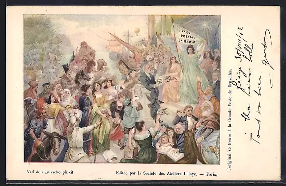 AK Postgeschichte, Frau mit Fahne Union Postale Universelle vor Menschenmenge