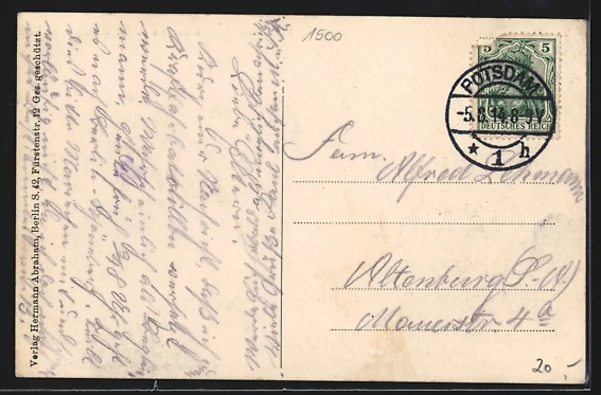 Personenbezogene Daten auf der Rückseite der Karte wurden durch blauen Textmarker unkenntlich gemacht. Die blauen Stellen sind auf die Vorderseite durchgeweicht und wirken sich negativ auf das Postkartenfoto aus