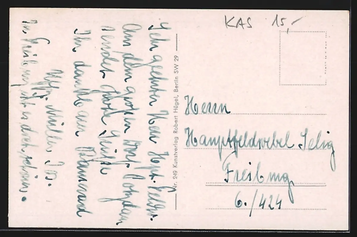 Personenbezogene Daten auf der Rückseite der Karte wurden durch blauen Textmarker unkenntlich gemacht. Die blauen Stellen sind auf die Vorderseite durchgeweicht und wirken sich negativ auf das Postkartenfoto aus