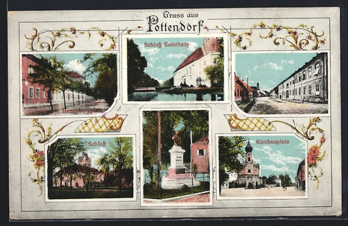 AK Pottendorf, Schloss Esterhazy, Kirchenplatz, Franz Josef I. Denkmal, Hennebergplatz