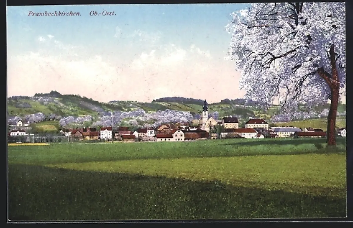 AK Prambachkirchen /O.-Ö., Ortsansicht mit blühenden Bäumen