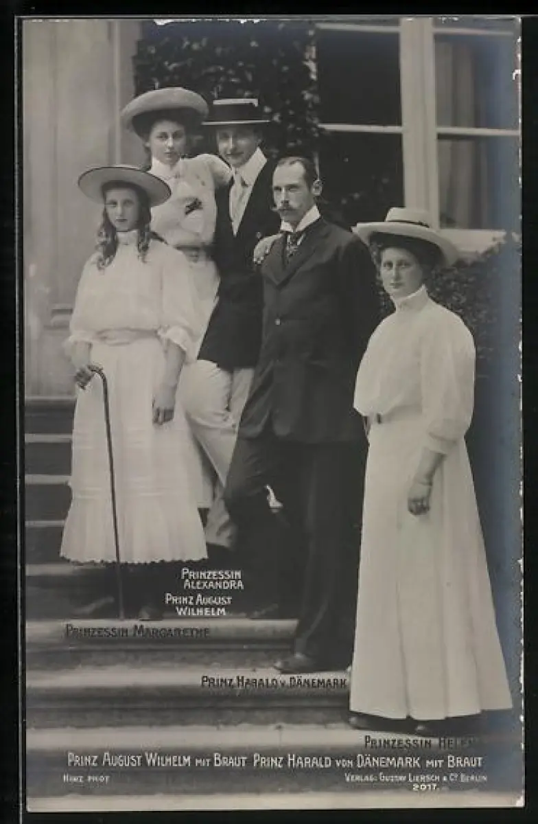 AK Prinz August Wilhelm mit Braut, Prinz Harald von Dänemark mit Braut und Prinzessin Margarethe