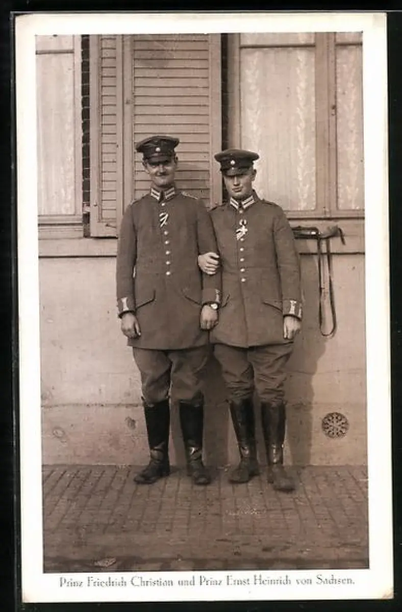AK Prinz Friedrich Christian und Prinz Ernst Heinrich von Sachsen, beide in Uniform vor einem Haus stehend
