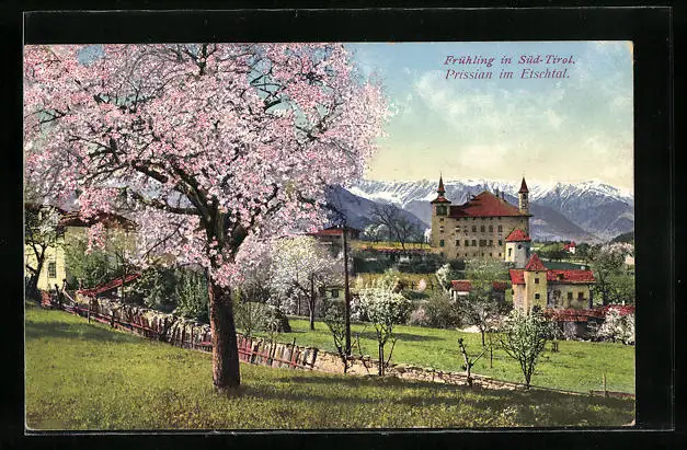 AK Prissian, Ortspartie mit blühenden Obstbäumen