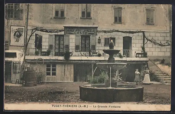 AK Puget-Théniers, La Grande Fontaine devant le café et les habitants