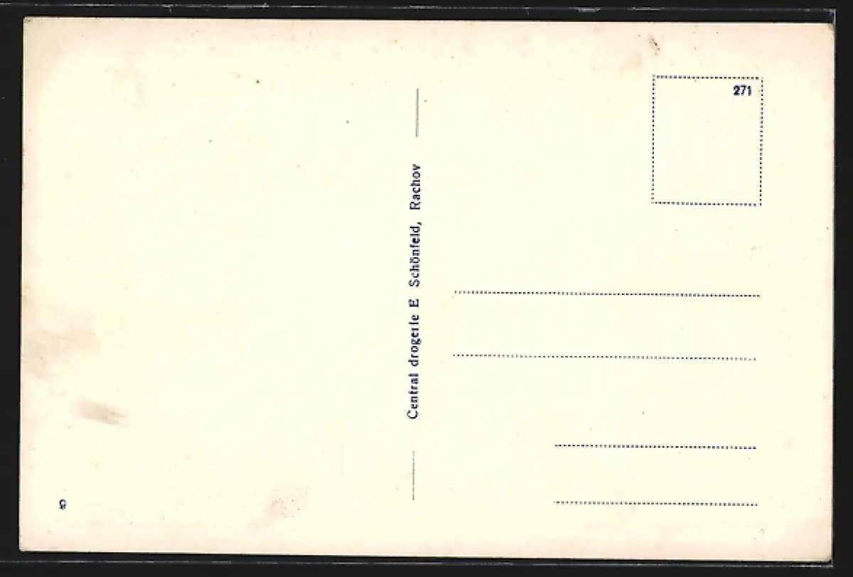Personenbezogene Daten auf der Rückseite der Karte wurden durch blauen Textmarker unkenntlich gemacht. Die blauen Stellen sind auf die Vorderseite durchgeweicht und wirken sich negativ auf das Postkartenfoto aus