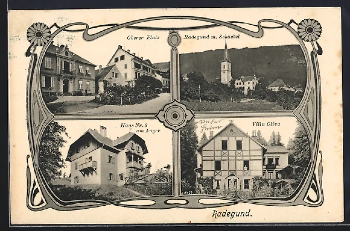 AK Radegund am Schröckel, Villa Oliva, Haus Nr. 3 am Anger, Oberer Platz, Kirche