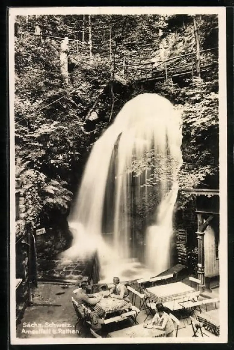 AK Rathen /Sächs. Schweiz, Amselfall mit Besuchern im Gasthof