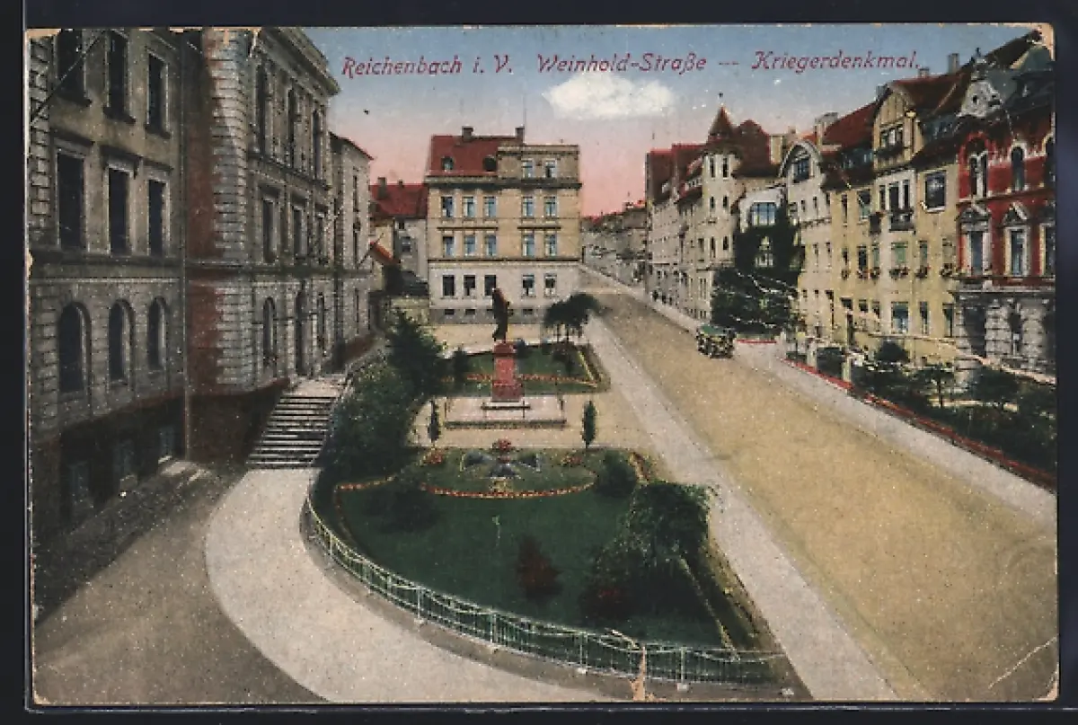 AK Reichenbach i. V., Weinhold-Strasse mit Krieger-Denkmal