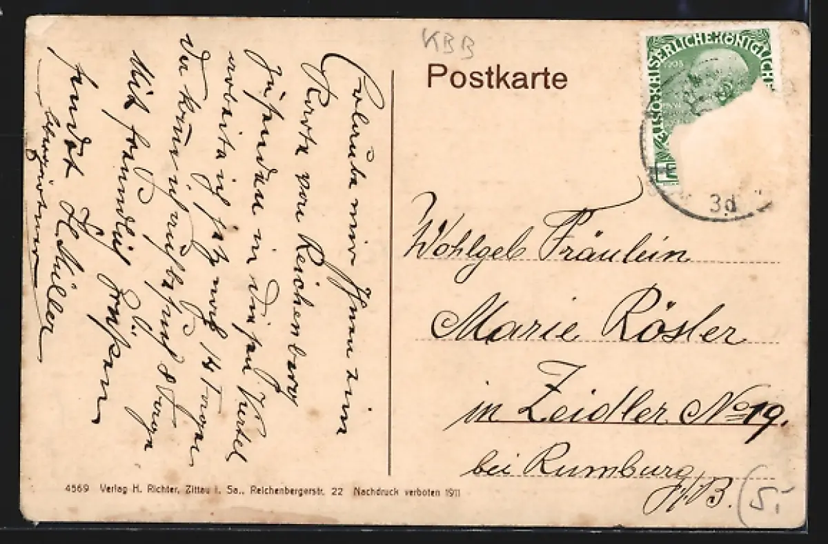 Personenbezogene Daten auf der Rückseite der Karte wurden durch blauen Textmarker unkenntlich gemacht. Die blauen Stellen sind auf die Vorderseite durchgeweicht und wirken sich negativ auf das Postkartenfoto aus