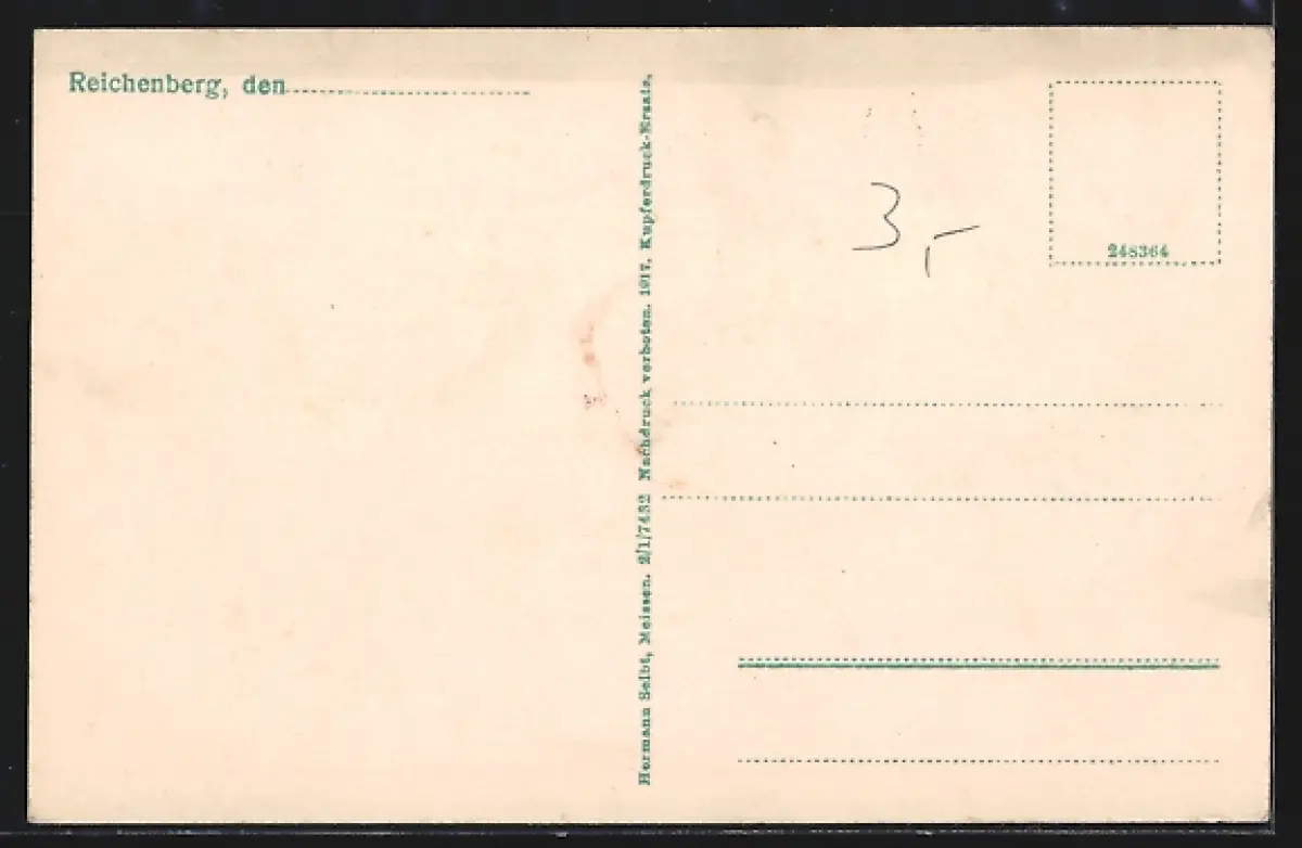 Personenbezogene Daten auf der Rückseite der Karte wurden durch blauen Textmarker unkenntlich gemacht. Die blauen Stellen sind auf die Vorderseite durchgeweicht und wirken sich negativ auf das Postkartenfoto aus