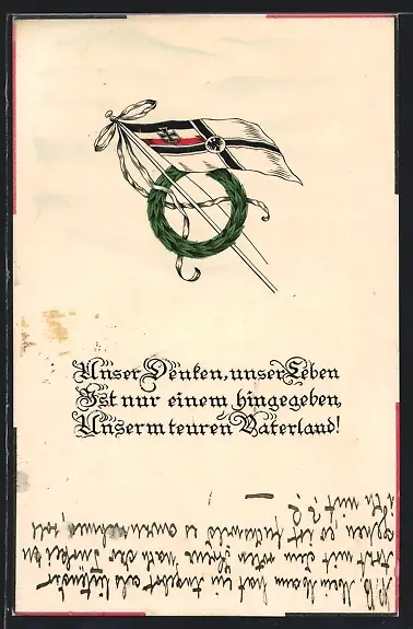 AK Reichskriegsflagge mit Lorbeerkranz an einem Mast