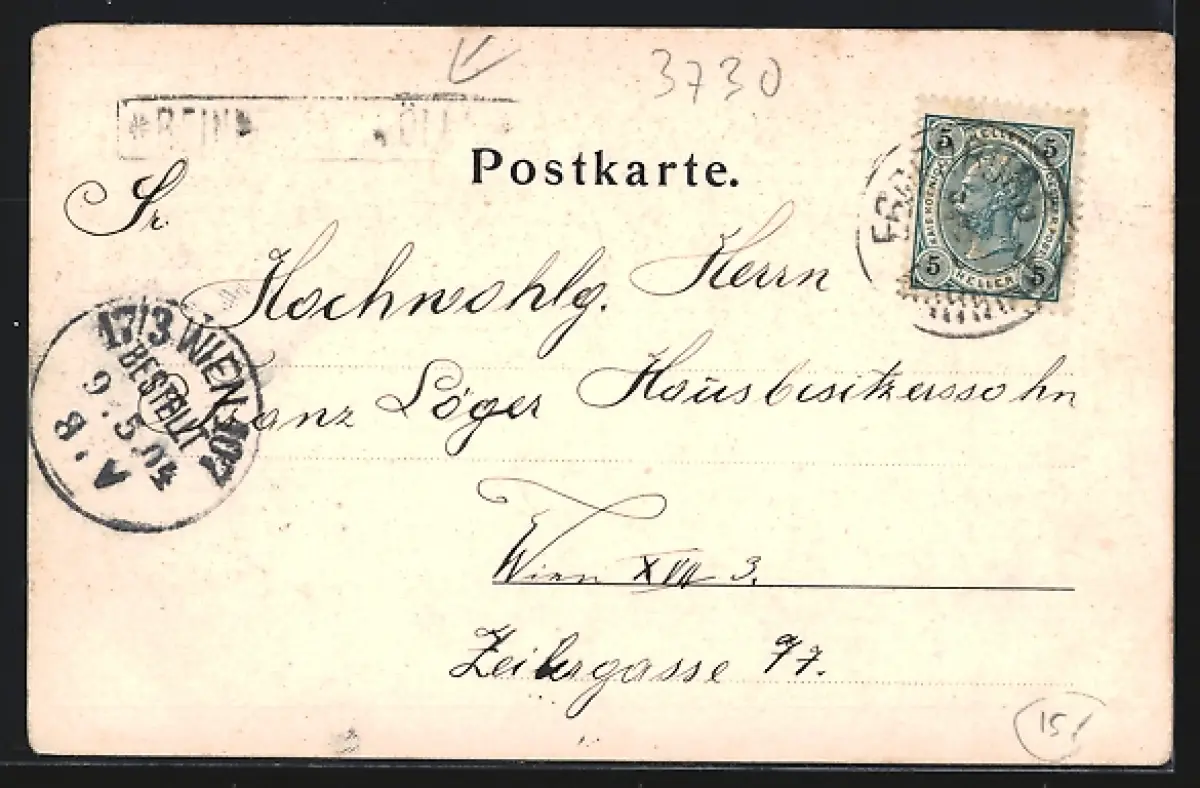 alte Ansichtskarte, gelaufen 1904, Eckknicke links u. rechts, Abriebspur re. oben, guter Zustand