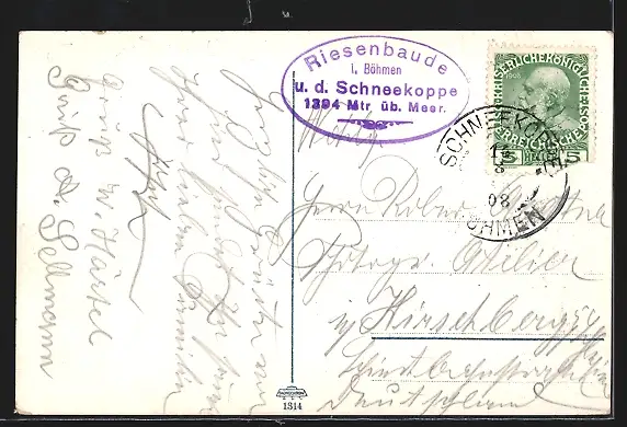 AK Riesenbaude, Gebäude mit Schneekoppe