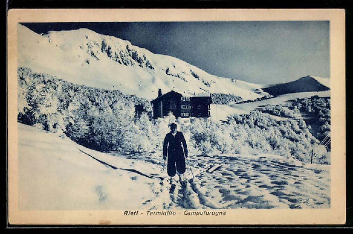 AK Rieti, Terminillo, Campoforogna, paesaggio innevato con escursionista e edificio alpino