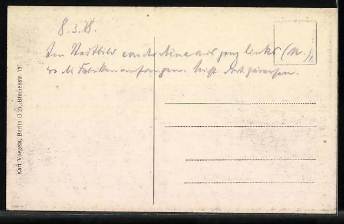 Personenbezogene Daten auf der Rückseite der Karte wurden durch blauen Textmarker unkenntlich gemacht. Die blauen Stellen sind auf die Vorderseite durchgeweicht und wirken sich negativ auf das Postkartenfoto aus
