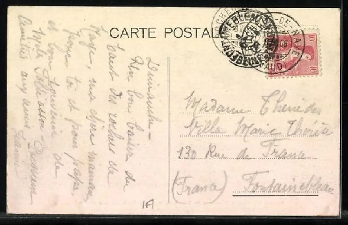 Personenbezogene Daten auf der Rückseite der Karte wurden durch blauen Textmarker unkenntlich gemacht. Die blauen Stellen sind auf die Vorderseite durchgeweicht und wirken sich negativ auf das Postkartenfoto aus
