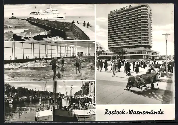 AK Rostock-Warnemünde, Hotel Neptun, Hafeneinfahrt mit Leuchtturm und Passagierschiff, Schwimmbad