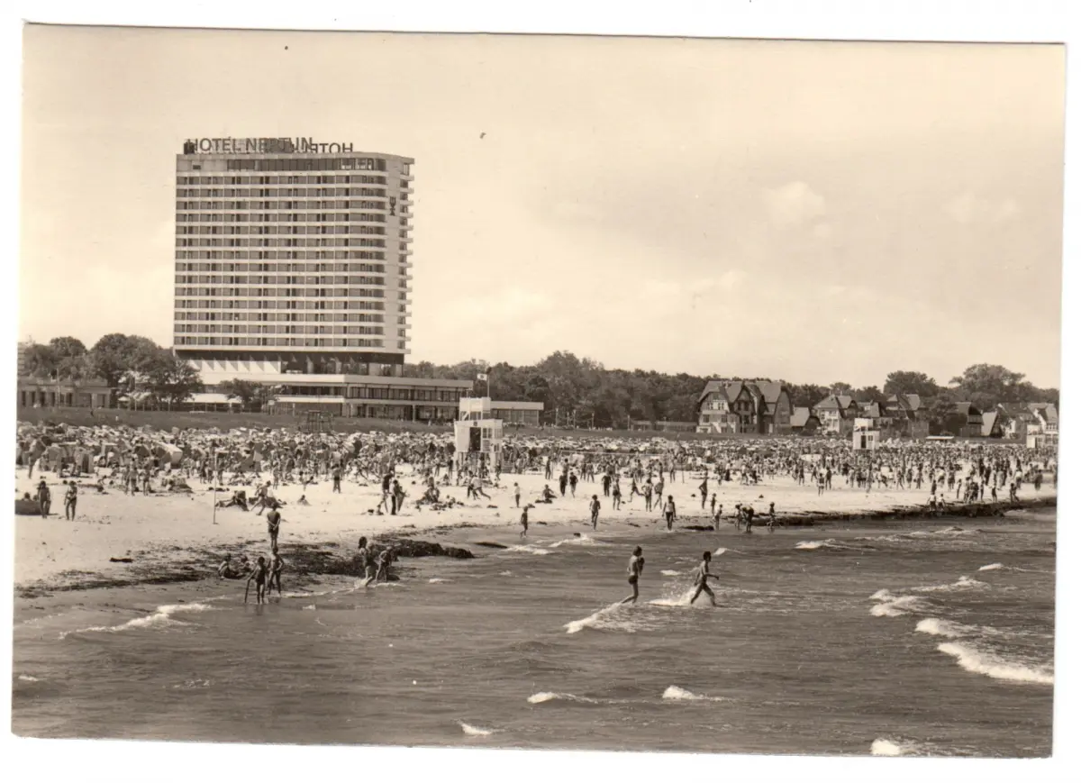 AnsichtskarteRostock-WarnemündeStrand belebt am Hotel "Neptun"