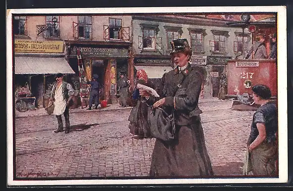 AK Rotes Kreuz Nr. 573, Stilles Heldentum, Rote Kreuz Schwester trägt in Stadt Briefe aus, Strassenbahn