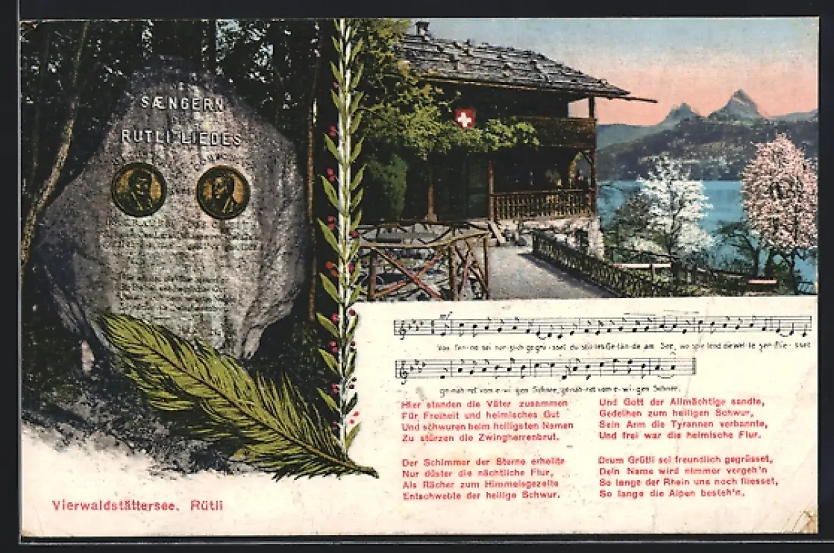 AK Rütli, Sänger des Rütli-Liedes-Denkmal und Unterkunftshaus am Vierwaldstättersee