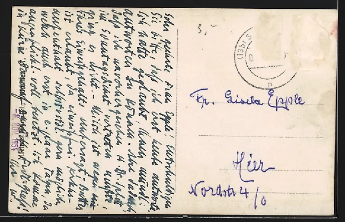 alte Ansichtskarte, gelaufen, Briefmarke entfernt, rückseitig Oberflächenschaden, guter Zustand