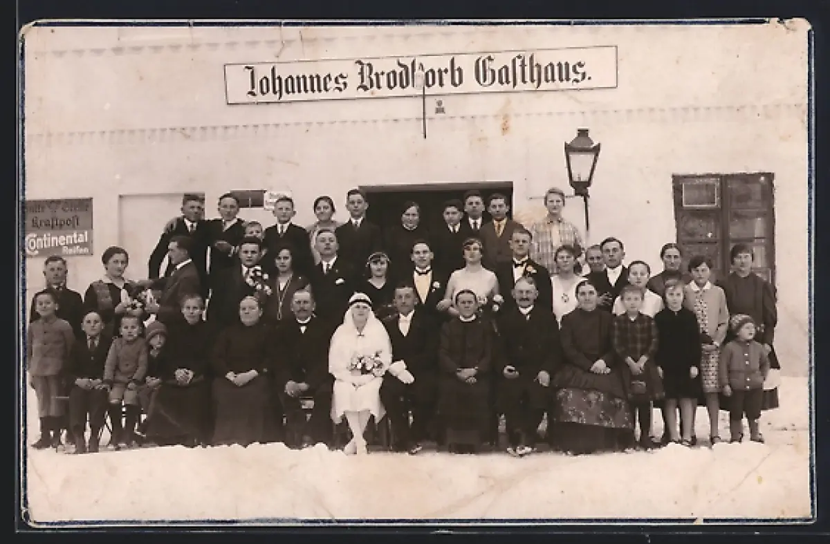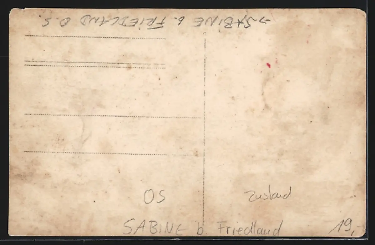 AK Sabine b. Friedland, Johannes Brodkorb Gasthaus, Gruppenfoto vor dem Gasthaus