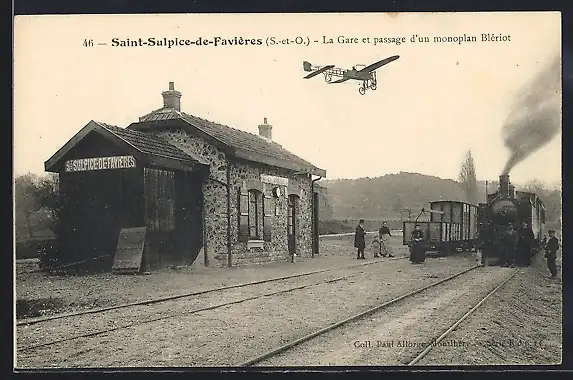 AK Saint-Sulpice-de-Favières /S.-et-O., La Gare et passage d`un monoplan Blériot