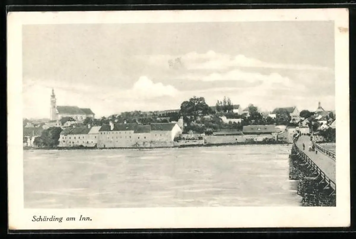 AK Schärding am Inn, Panorama mit Innufer, Brücke und Kirche