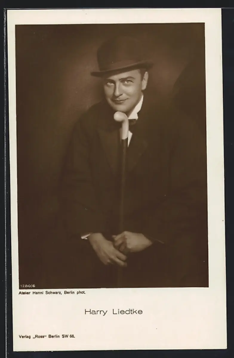 AK Schauspieler Harry Liedtke im Anzug mit Melone und Spazierstock posierend