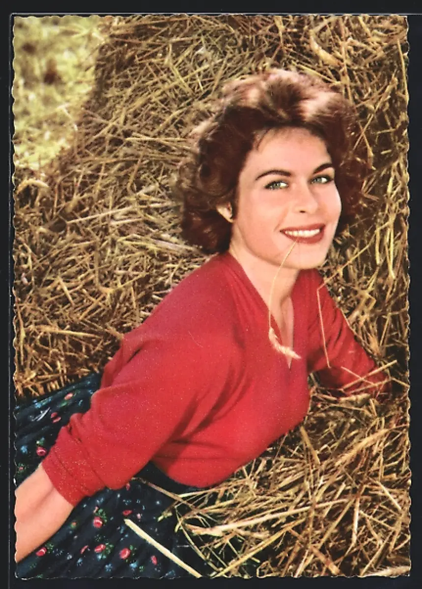AK Schauspielerin Babara Rütting im Heu liegend porträtiert