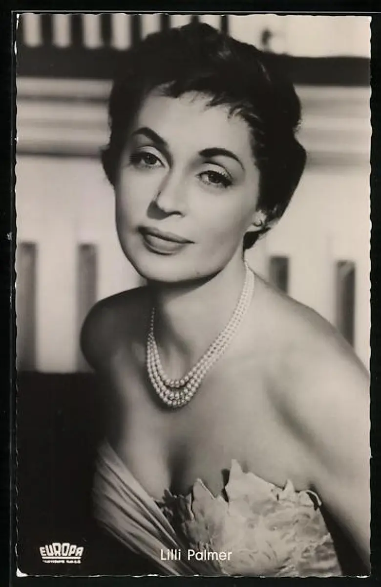 AK Schauspielerin Lilli Palmer, Portrait im Abendkleid mit Perlenkette in Zwischen Zeit und Ewigkeit