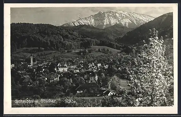 AK Scheibbs, Ortsansicht mit Kirche gegen den Ötscher