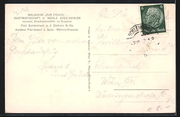AK Schleinbach a. d. Ostbahn, Waldheim zur Fichte, Gastwirtschaft u. Mühle Svec-Gehlen