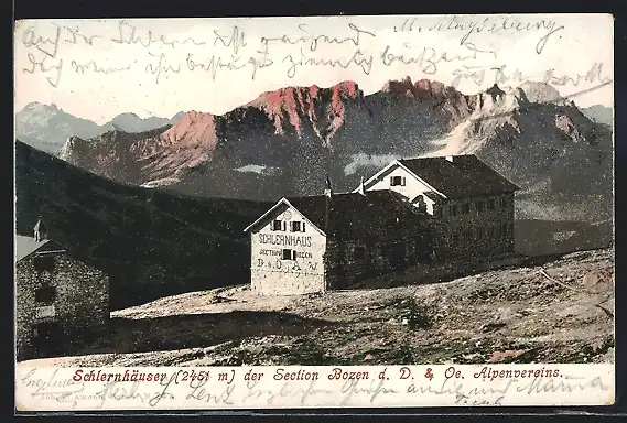 AK Schlernhaus, Ansicht mit Gebirgspanorama, Berghütte