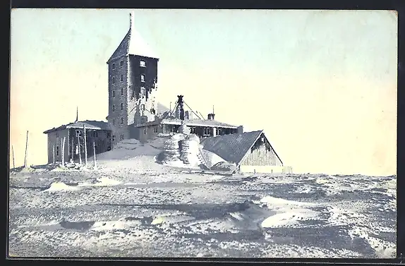 AK Schneegrubenbaude, Ansicht im Winter von der Rückseite