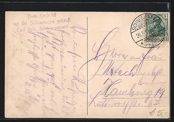 Personenbezogene Daten auf der Rückseite der Karte wurden durch blauen Textmarker unkenntlich gemacht. Die blauen Stellen sind auf die Vorderseite durchgeweicht und wirken sich negativ auf das Postkartenfoto aus