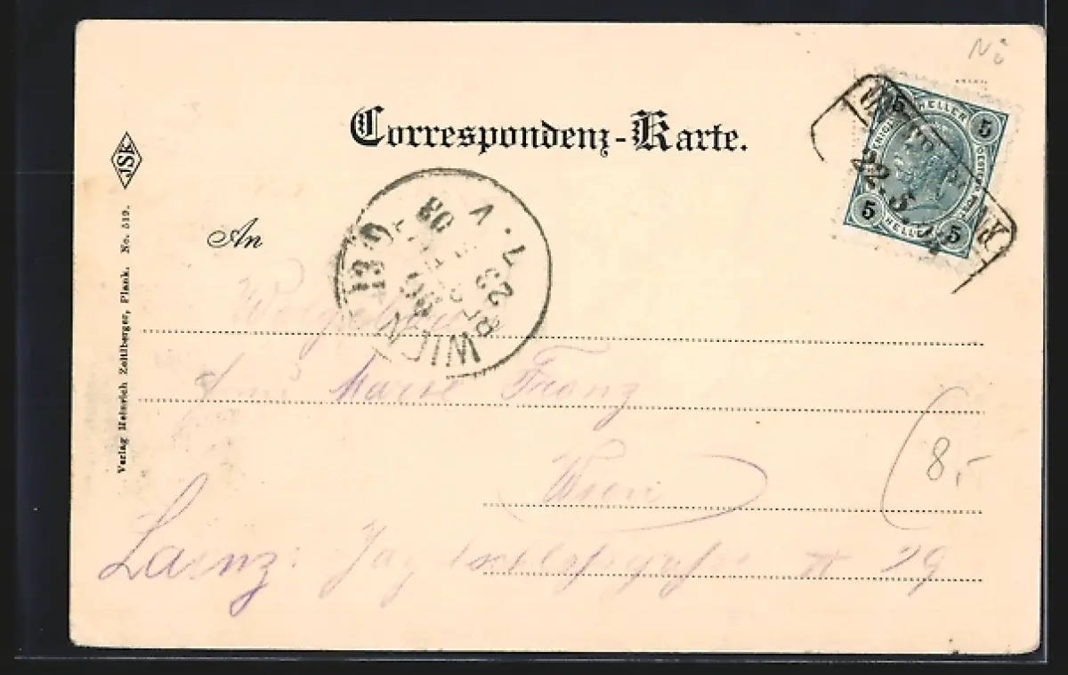 alte Ansichtskarte, gelaufen 1908, Eckknicke li. oben u. re. unten, Stempelspur, Bugspur li. unten, guter Zustand