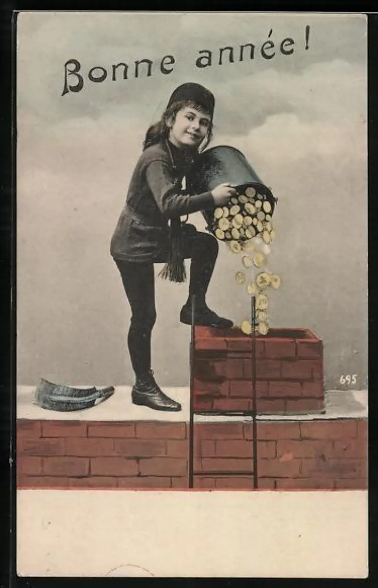 AK Schornsteinfegermädchen schüttet Münzen in den Schornstein, Bonne année