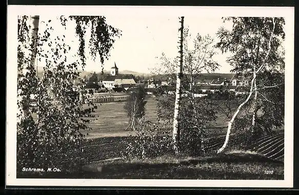 AK Schrems /N.-Oe., Ortsansicht durch ein paar Birken