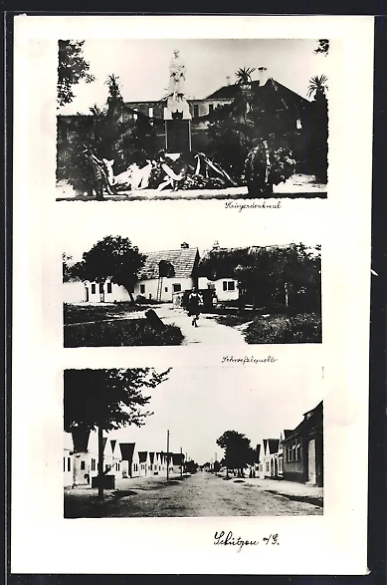 AK Schützen am Gebirge, Kriegerdenkmal, Schwefelquelle