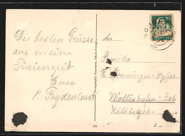 Personenbezogene Daten auf der Rückseite der Karte wurden durch blauen Textmarker unkenntlich gemacht. Die blauen Stellen sind auf die Vorderseite durchgeweicht und wirken sich negativ auf das Postkartenfoto aus