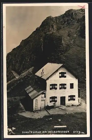 AK Schutzhaus am Wildseeloder, Blick auf die Hütte vom Berghang aus