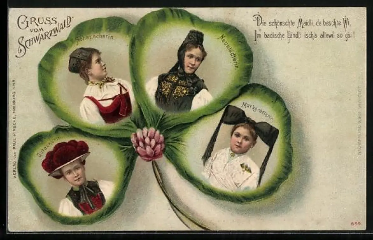 AK Schwarzwälder Trachten, Schapacherin, Neustädterin, Markgräflerin, Gutacherin, Kleeblatt