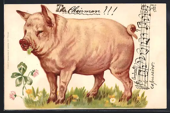 AK Schwein auf einer Blumenwiese frisst ein Kleeblatt