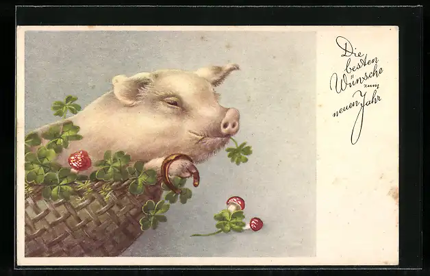 AK Schwein im Korb mit Hufeisen und Glücksklee, Neujahrsgruss